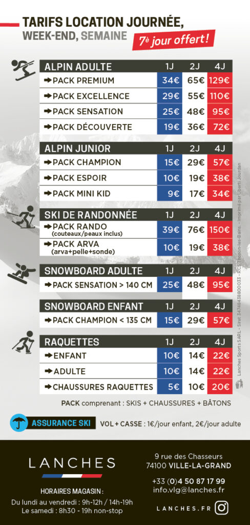 Tarifs location de ski journée, week-end, semaine chez LANCHES Ville-La-Grand